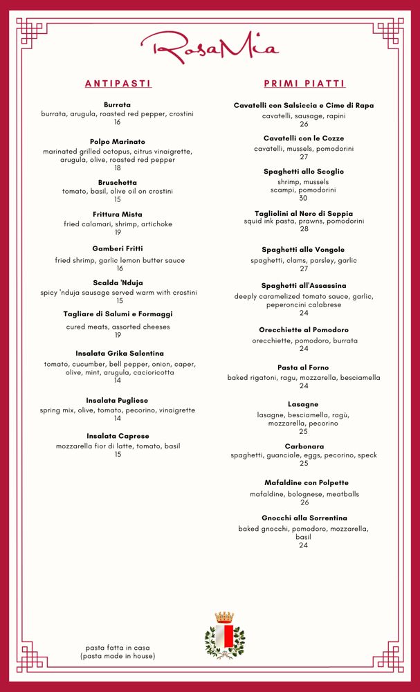 Whether you're here for dinner or takeout, you will find that the blend of delightful flavors and inviting service makes dining at RosaMia a truly enchanting experience.